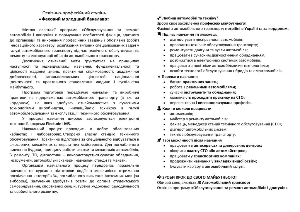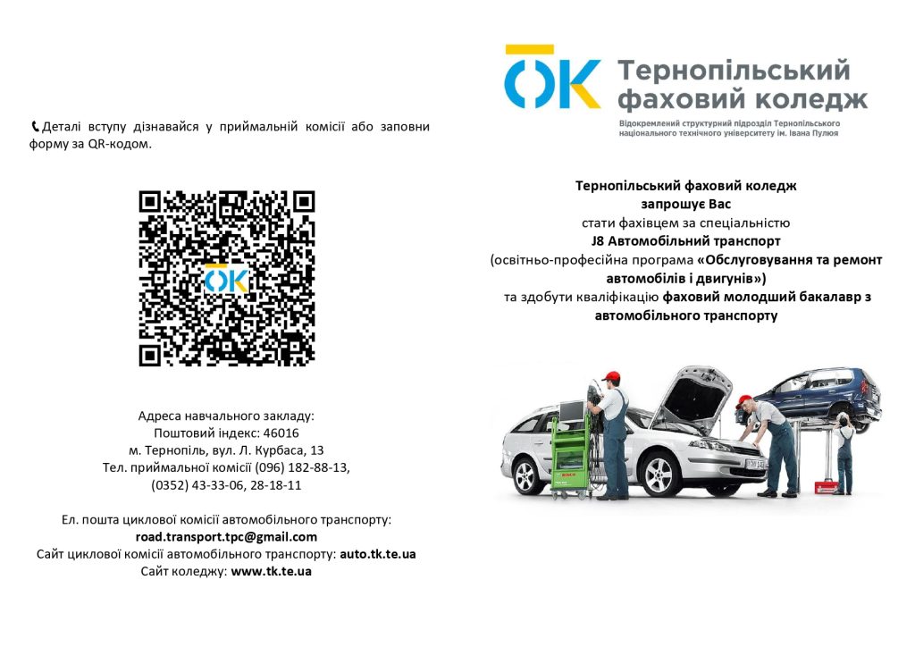 У коледжі Ви здобудете навички з технічної експлуатації та ремонту транспортних засобів, організації технологічних процесів на автотранспортних підприємствах; навчитеся аналізувати роботу мехатронних модулів і систем автомобіля, експлуатувати й обслуговувати їх.